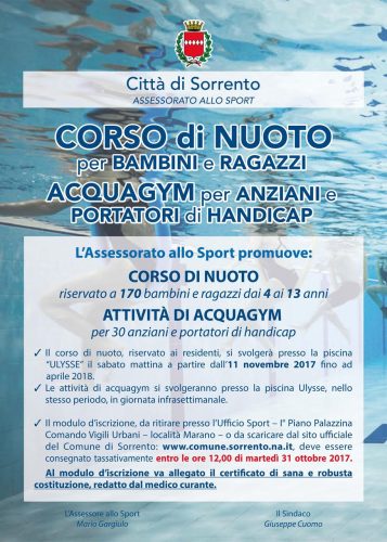 Anche per quest’anno l’Assessorato allo Sport del Comune di Sorrento promuove, per cittadini residenti, corsi gratuiti di nuoto riservati a 170 bambini e ragazzi e corsi di acquagym per 30 persone anziane e per persone portatrici di handicap. Entrambi i corsi si svolgeranno presso la piscina Ulysse, in via del Mare.