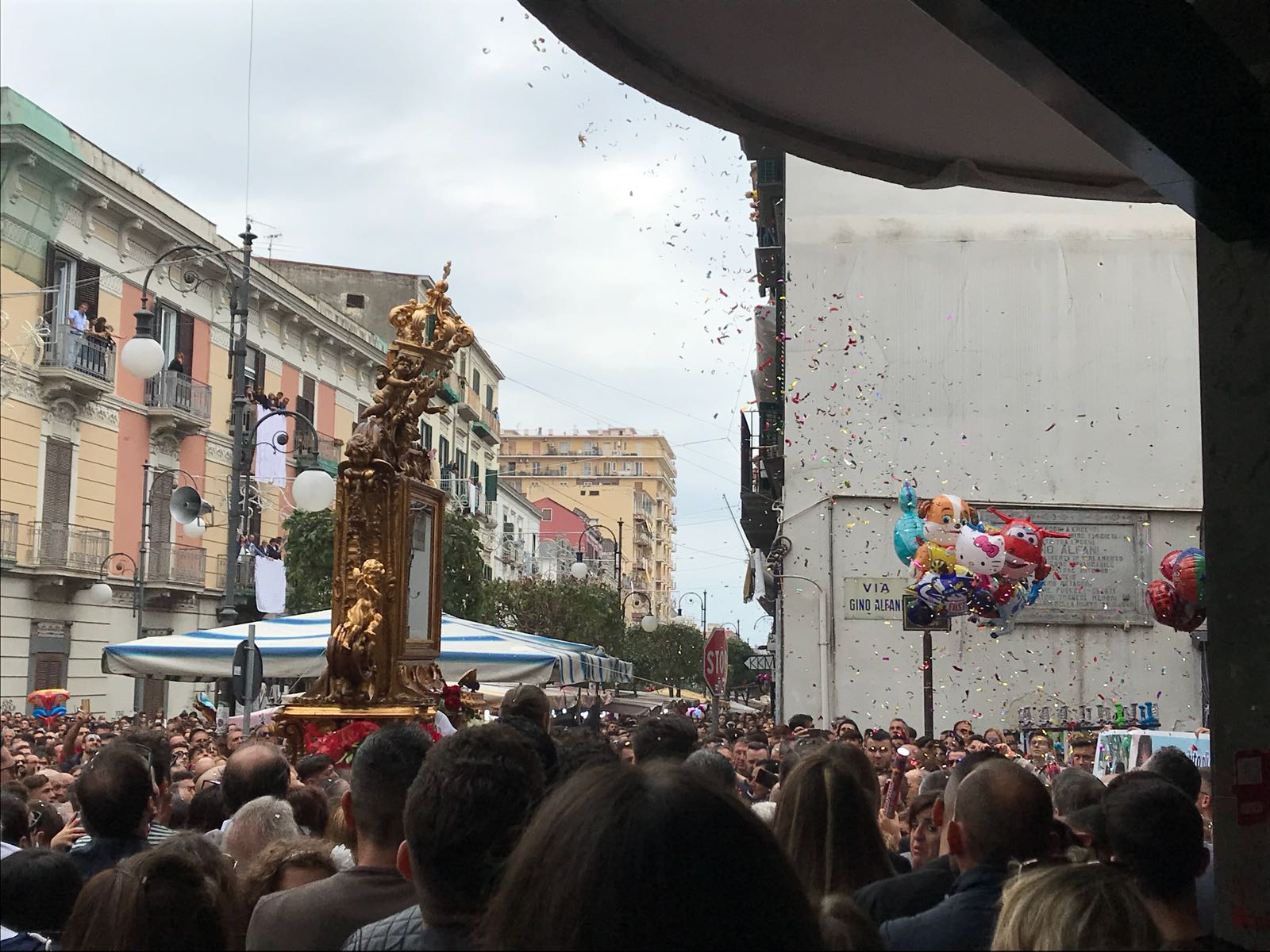 Oplonti in festa tra luci, ruota panoramica e spettacoli. Durante il tragitto, il corteo si è fermato all’altezza di via Gino Alfani. La Santa Patrona rivolta verso la zona del crollo che il 7 luglio ha portato alla morte otto persone e il silenzio della folla.