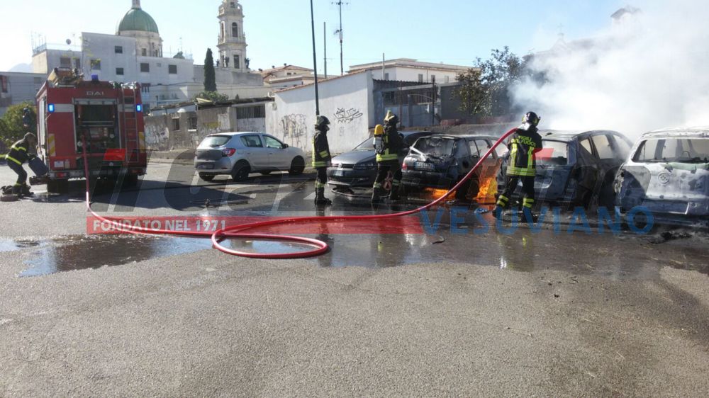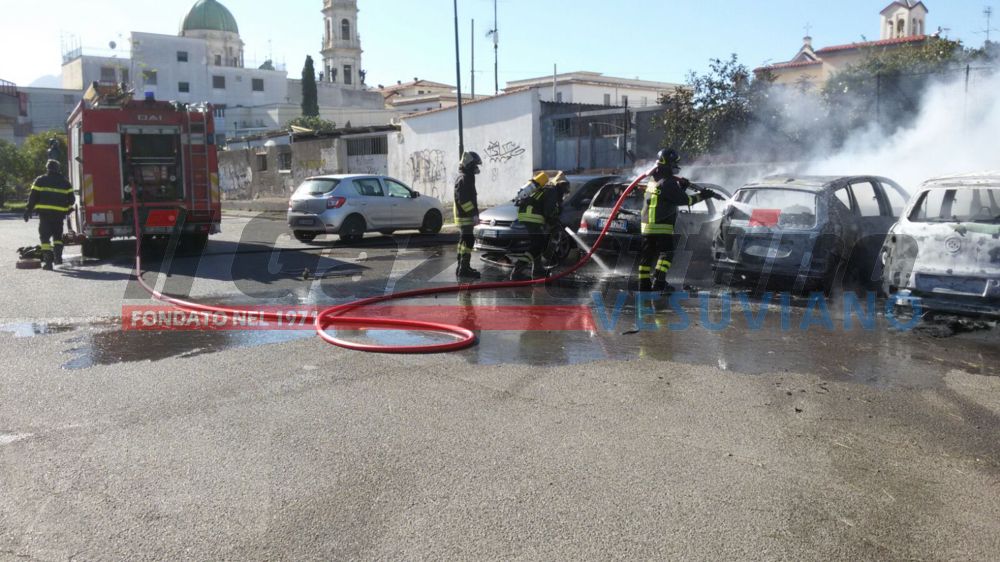 Erano circa le 11 quando una pattuglia della Polizia Municipale in transito proprio su via Nolana, veniva informato di quanto stava accadendo: un’automobile in sosta nel parcheggio di via Fucci, alle spalle della stazione della Circumvesuviana di Pompei, stava andando a fuoco. I caschi bianchi pompeiani in pochi istanti erano sul luogo. Le auto ormai fagocitate dalle fiamme erano già due. Immediata la richiesta di intervento ai Vigili del Fuoco mentre gli agenti della municipale già sul posto tentavano di limitare i danni alle auto parcheggiate nei pressi delle due già in fiamme con l’estintore in dotazione nell’autopattuglia. Tentativo che rallentava le fiamme ma non riusciva a fermarle.