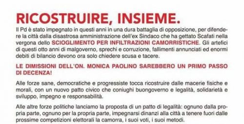 Con lo stesso comunicato il PD attacca la precedente amministrazione, rea di aver portato allo scioglimento per infiltrazioni camorristiche il comune di Scafati e di essere artefice di “otto anni di malgoverno, sprechi, corruzione, fallimenti annunciati ed enormi debiti di bilancio”, chiedendo infine le dimissioni dell’On. Monica Paolino, consigliere regionale.