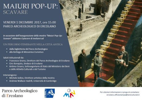 Il 1 dicembre 2017 vedrà una nuova tappa del percorso avviato nello scorso maggio, per celebrare il 90° anniversario dalla campagna di scavo avviata da Amedeo Maiuri, lungimirante studioso e Soprintendente mosso dalla sfida di trasformare la città antica in un museo all’aria aperta. Saranno proposti in questa giornata due eventi per avvicinare il pubblico alla storia degli scavi di Ercolano tramite nuovi studi e l’arte contemporanea.