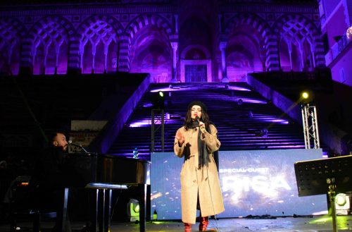 Stella della serata è stata Arisa. Il suo ingresso in scena scendendo la scala monumentale del Duomo, dopo la fase di riscaldamento affidata alla Nientedimeno Swig Band, ha dato il via ad un intenso spettacolo per voce e piano. L’artista ha incantato con la sua armoniosità vocale e ha coinvolto il pubblico con la sua ironia. Le prime note che hanno colmato la piazza dominata dalle inconfondibili volte della cattedrale di Sant’Andrea sono state quelle di “Meraviglioso amore mio”, continuando poi per una lunga carrellata di successi che hanno compreso tra l’altro i due brani vincitori del Sanremo (Controvento e Sincerità), la hit dell’estate “L’esercito del selfie” cantata, assieme a due fan dopo un simpatico siparietto col pubblico, passando poi per “La Notte”, “Ho cambiato i piani”, “Malamorenò”, “La Notte” ed altri brani fino alla conclusione con “Pace”. Durante il concerto, Arisa ha omaggiato Pino Daniele cantando “ ‘O ssaje comme fa ‘o core”. Il dono speciale dell’artista ad Amalfi, nella notte di Capodanno, è stata per sua stessa ammissione una delle primissime esecuzioni live di “Vasame”, il brano che fa da colonna sonora al film “Napoli Velata” di Ferzan Ozpetec. Non sono mancati i momenti di grande ironia, che hanno visto l’artista giocare col pubblico, pungolarlo con qualche battuta in napoletano, fino al simpatico siparietto col sindaco di Amalfi Daniele Milano al quale, durante l’improvvisazione dei ritornelli di alcuni di brani tradizionali di liscio non previsti dalla scaletta e proposti al pubblico dopo che un fan aveva urlato “facci ballare!”, ha chiesto in cambio in omaggio una villa ad Amalfi con vista sul mare.