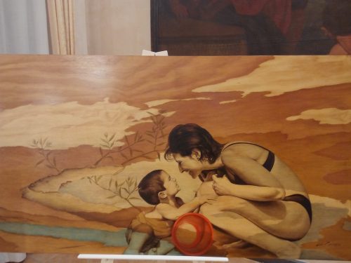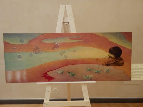 Ogni opera è accompagnata da una breve didascalia che aiuta il visitatore ed entrare nella sensibilità di quanto l’opera esprime come “Sogni rubati” che denuncia la fragilità dei più piccoli, degli indifesi, dei loro sogni infranti, delle vite spezzate o mai vissute.