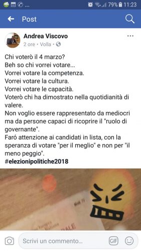 Nei giorni scorsi, con un post dalla sua pagina ufficiale, tra il provocatorio ed il sarcastico, Andrea Viscovo, ex sindaco di Volla, ha dichiarato per chi voterá il 4 marzo.