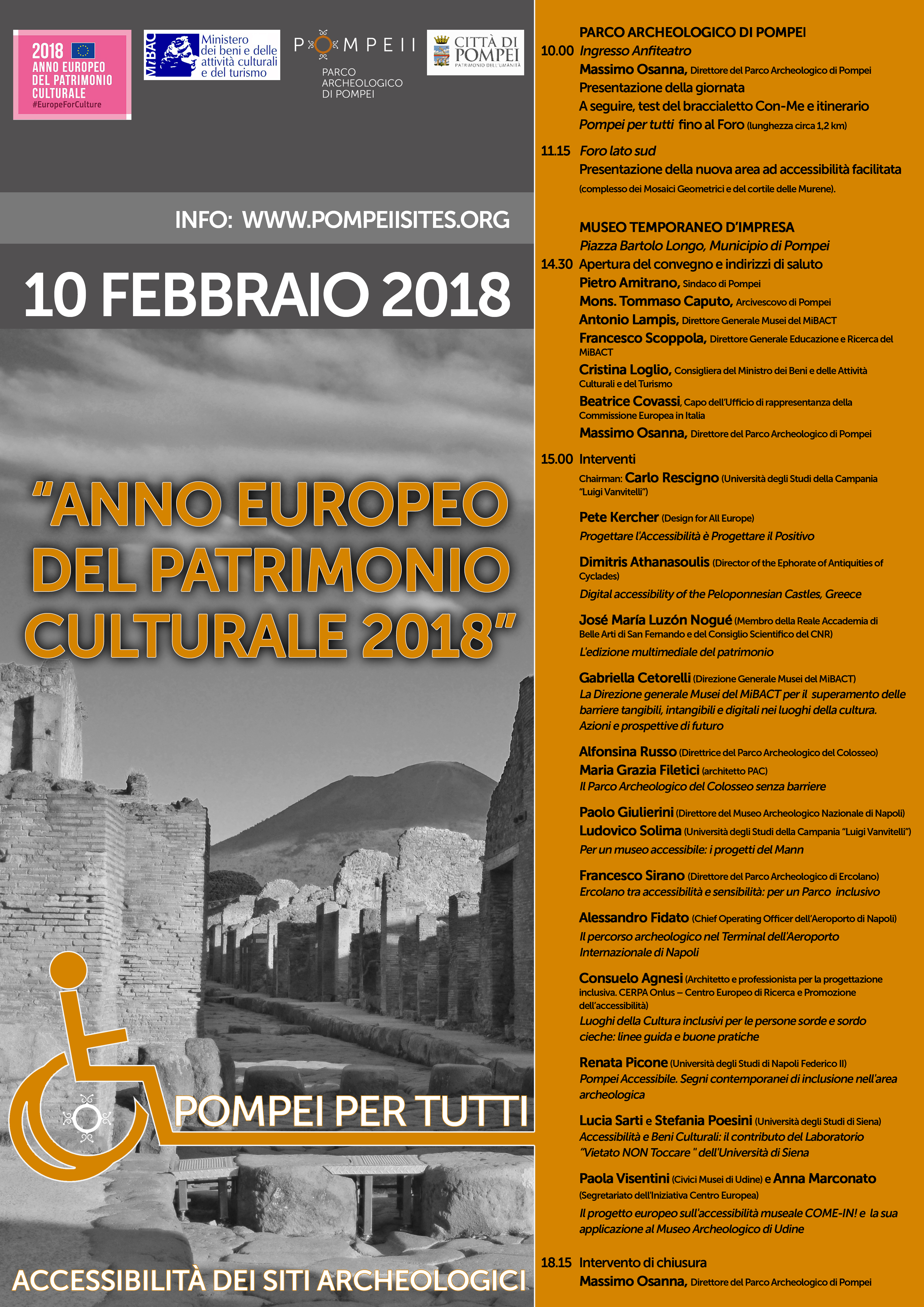 Il 10 febbraio presso il Parco Archeologico di Pompei e il Comune di Pompei si celebrerà l’”Anno europeo del patrimonio culturale 2018. Pompei per tutti. Accessibilità dei siti archeologici” focalizzando su un tema, quello dell’accessibilità al nostro patrimonio culturale, condizione di fondamentale importanza eppur non ancora scontata.