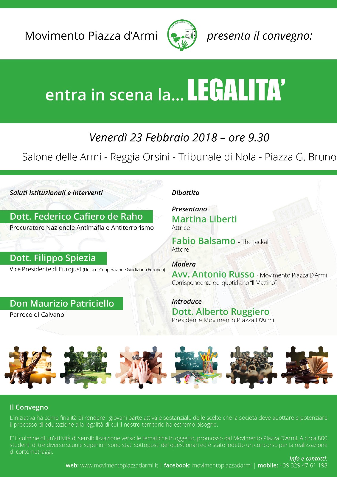 Nola – Entra in Scena la Legalità è il titolo del convegno organizzato dal Movimento Piazza d’armi, che avrà luogo venerdì 23 febbraio 2018, con inizio alle 9.30, nel Salone delle Armi del tribunale di Nola, in piazza Giordano Bruno.