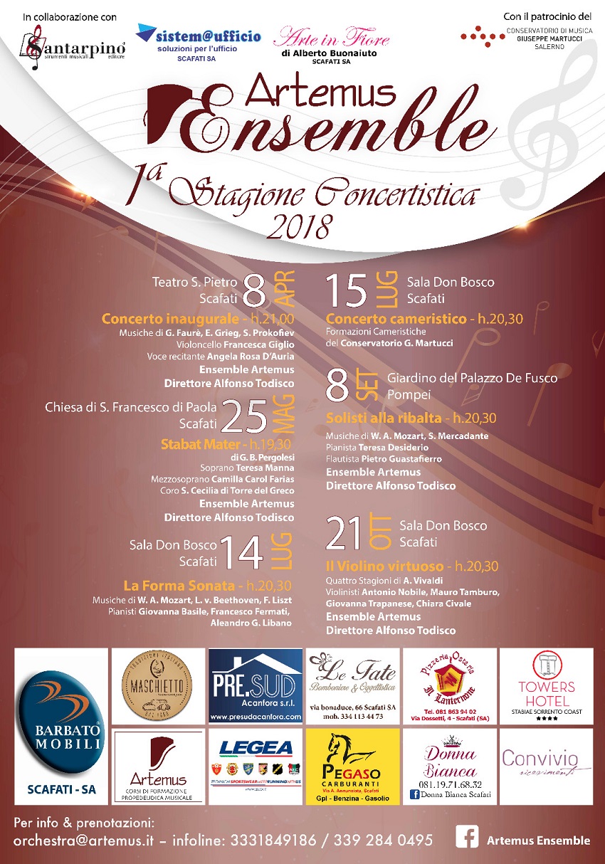 Si alza il sipario sulla prima stagione concertistica dell’Ensemble Artemus, l’orchestra giovanile fondata dai maestri Francesco D’Aprea e Alfonso Todisco con l’ambizioso obiettivo di valorizzare i giovani del territorio attraverso la diffusione della cosiddetta “musica colta”. Sei gli appuntamenti in calendario, tra Scafati (Sa) e Pompei (Na), di cui la metà ad ingresso gratuito. Musica sinfonica ma non solo, perché gli eventi in programma, con il patrocinio del conservatorio “Giuseppe Martucci” di Salerno, prevedono anche l’esibizione di solisti d’eccezione (12 in tutto) e musica da camera.