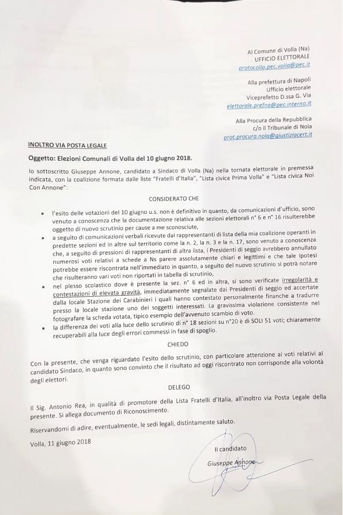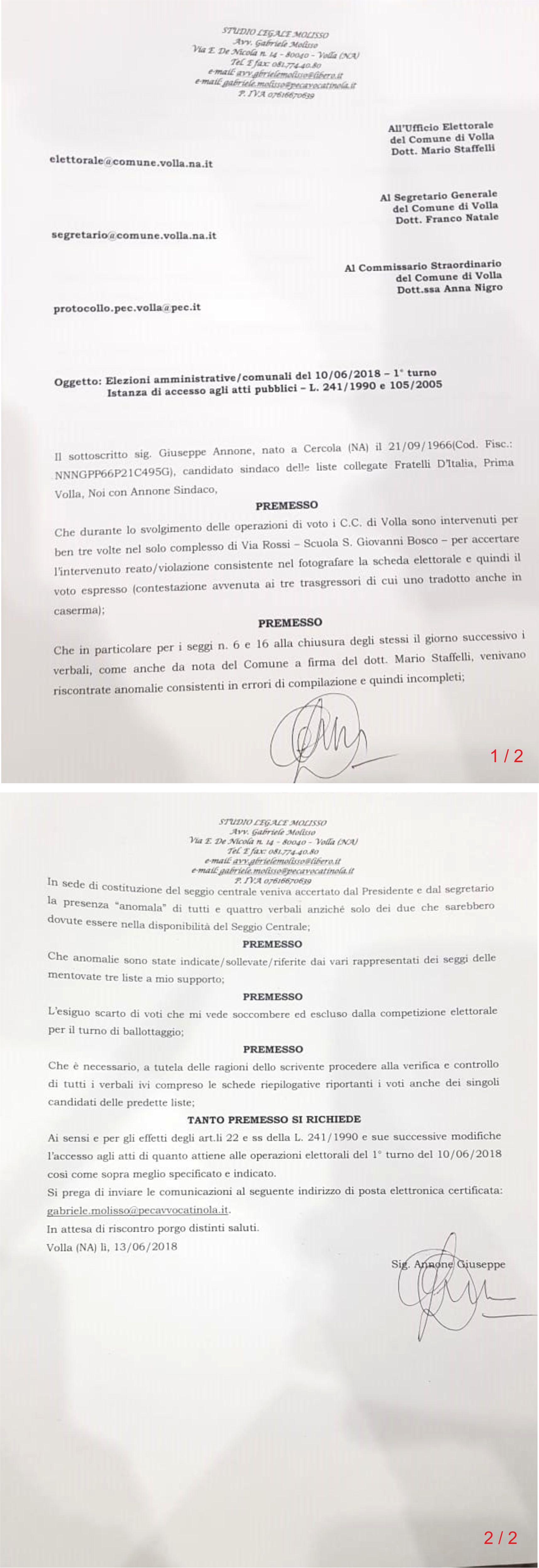 Questa mattina la coalizione che proponeva Annone sindaco ha presentato una domanda di accesso agli atti elettorali al comune di Volla, mentre già lunedì scorso era partita una denuncia/ricorso ufficiale per presunte svariate irregolarità che sarebbero state riscontrate in numerosi seggi.