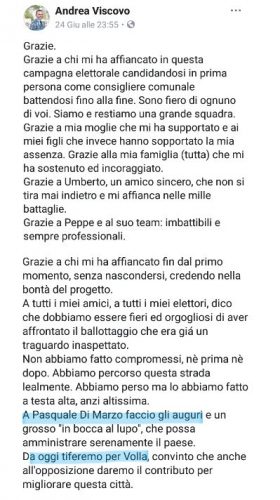 Dopo la sconfitta al ballottaggio, Viscovo immediatamente ringrazia i suoi elettori e fa gli auguri al suo avversario sui canali social.