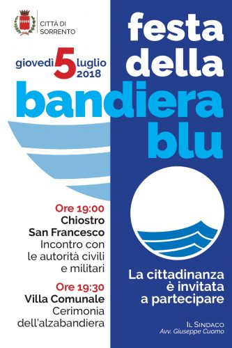 Luigi Di Prisco,Giovedì 5 luglio, a partire dalle ore 19, si terrà la Festa della Bandiera Blu, per celebrare l’ambito riconoscimento conquistato dalla Città di Sorrento.