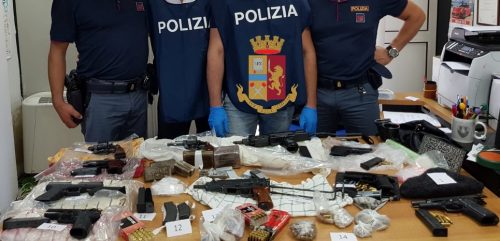 I poliziotti hanno rimosso gli elettrodomestici della cucina e dietro al forno hanno trovato 11 panetti di hashish per un peso di 1500 grammi, 3 bilancini e tutto il materiale per il confezionamento di singole dosi di stupefacente, nonché un borsello con all’interno altre 2 pistole, anche queste con colpo camerato e caricatore rifornito, quindi pronti all’uso.