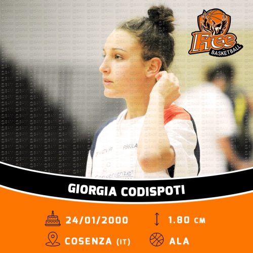 La società Givova Ladies è lieta di comunicare il tesseramento numero sei della sua estate con l’approdo in maglia neroarancio di Giorgia Codispoti. Ala di 180 cm, nata a Cosenza il 24 Gennaio del 2000, inizia a giocare all’età di 8 anni con la società Basket Rende dove nasce la sua passione per la pallacanestro raggiungendo con l’Under 17 l’interzona di categoria. Con il club della provincia cosentina, nei due anni consecutivi (2013 e 2014) ottiene la partecipazione al campionato nazionale 3vs3 Join The Game. Nel 2015 inizia la sua prima esperienza lontano da casa, giocando nella Pb63 Lady di Battipaglia per tre anni di fila e disputando i campionati delle categorie U16, U18 e U20, conquistando la medaglia d’argento alle finali nazionali di Roseto e Battipaglia.