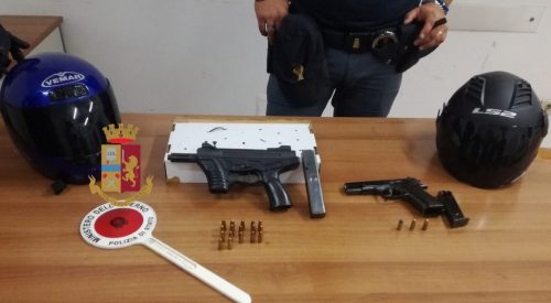 Effettuando una bonifica dell’area dove era stato abbandonato lo scooter , in particolare nei giardinetti antistanti la via Alveo Artificiale, i poliziotti hanno rinvenuto una pistola mitragliatrice marca Luger, fornita di caricatore con 16 cartucce 9×21 ed 1 9×19 incamerata e, poco distante in una cabina dell’acquedotto, un casco presumibilmente indossato dal passeggero scappato.