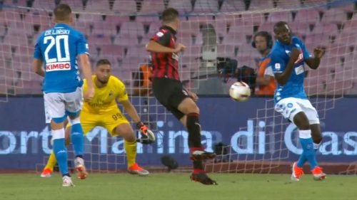 Buona partita del Napoli che va sotto di due gol sulle due uniche azioni in attacco del Milan per due inserimenti sulle fasce e con i due esterni Rui ed Hysaj poco attenti in entrambe le occasioni.