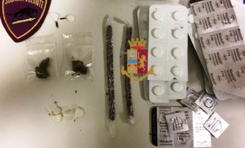 Lo spacciatore, sotto il cappellino indossato, aveva due stecche di hascisc, quattro dosi di cocaina, due di eroina, due bustine di marijuana, 117compresse di Rivotril e 25euro nella tasca dei pantaloni. Il tutto è stato sottoposto a sequestro.
