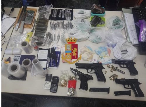 In particolare in uno sgabuzzino nelle vicinanze della porta d’ingresso i poliziotti hanno rinvenuto e sequestrato n. 4 bilancini elettronici di precisione, numerosissime bustine e rotoli di cellophane, n. 2 accendigas, un tagliere in legno, n. 2 coltelli sporchi di hashish, diverse tavolette di hashish per un peso di circa kg 1,420, n. 4 pistole semiautomatiche complete di proiettili, n. 70 cartucce cal. 7.65.