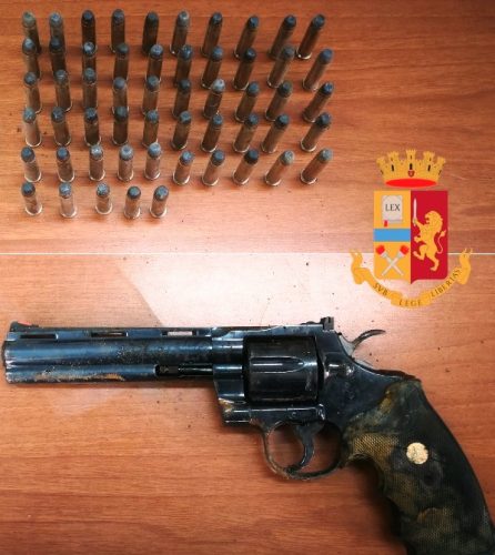All’interno di un fondo agricolo in via Plinio, i poliziotti, hanno rinvenuto e sequestrato un revolver marca “Python 357 Magnum” e 55 cartucce “CBC 357 Magnum”, il tutto era sotterrato ad una profondità di circa 20/30 cm ed avvolti in un involucro di plastica a sua volta contenuto in una busta.