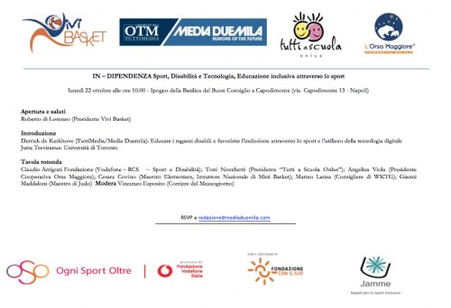 Sport, tecnologia, disabilità, educazione: saranno questi i temi al centro della tavola rotonda intitolata “In – Dipendenza” che si terrà lunedì 22 ottobre alle ore 10 presso l’Ipogeo della Basilica del Buon Consiglio a Capodimonte (via Capodimonte 13 – Napoli). L’evento è stato organizzato da Vivi Basket, Osservatorio TuttiMedia – Media Duemila, Tutti a Scuola onlus e cooperativa sociale L’Orsa Maggiore.