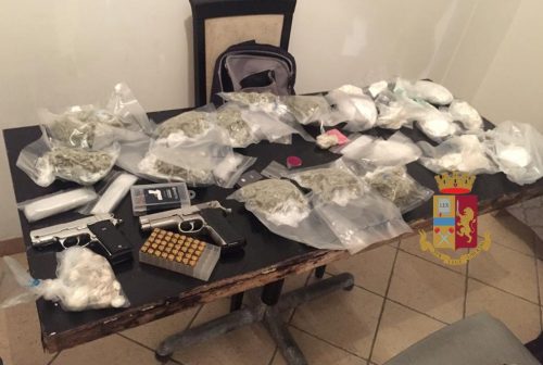 Infatti, in un mobile ad incasso, gli agenti hanno rinvenuto e sequestrato una pistola con marchio e matricola punzonati, una pistola Smith & Wesson completa di caricatore con 10 cartucce, 43 cartucce, 8 pezzi di cocaina per un peso di 651 grammi, 5 buste della stessa droga per un peso di 964 grammi, 2 pezzi di hashish per un peso di 210 grammi, 10 sacchetti contenenti bustine di marijuana per un peso di 600 grammi, 51 pasticche di colore rosa per un peso di 20 grammi, 20 dosi di eroina per un peso di 41 grammi, 6 dosi di cocaina per un peso di 6 grammi, una busta di cocaina per un peso di 18 grammi ed infine 1 bustina di eroina per un peso di 14 grammi.