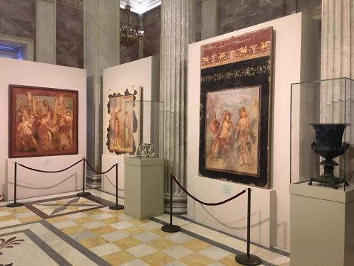 Gli splendidi affreschi con “Zeus in trono” e “Achille e Briseide” dalla Casa del Poeta Tragico (MANN) il “Dioniso e Arianna” e “Alessandro e Rossane” dalla Casa del Bracciale d’Oro – dal Parco Archeologico di Pompei – e ancora l’eccezionale tarsia in marmo con “Scena dionisiaca” riemersa dalla Casa dei Capitelli colorati e conservata nelle collezioni del Museo Archeologico Nazionale di Napoli, raccontano le gesta di divinità ed eroi rappresentandoli, secondo l’ uso del tempo, da soli o con gli attributi che ne rendono immediata l’identificazione.