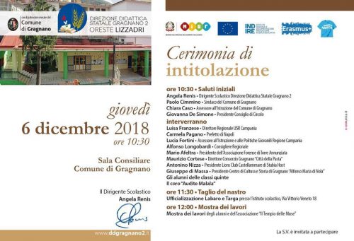 Presso la sala consiliare del Comune di Gragnano, giovedì 6 dicembre alle ore 10.30, si terrà la cerimonia di intitolazione dell’ Edificio Scolastico di via V. Veneto,18.