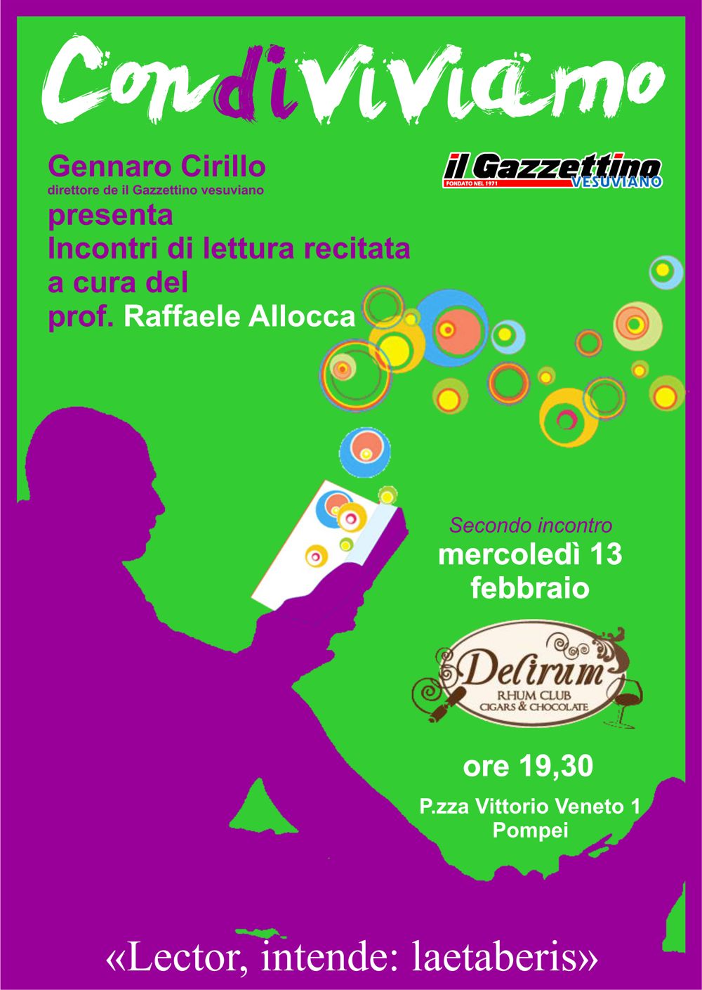 Ah, dimenticavo, il Gazzettino vesuviano sarà ancora al Delirum mercoledì prossimo con il secondo appuntamento con “CONdiVIVIAMO”, letture recitate a cura del prof. Raffaele Allocca. Siete tutti invitati, questa sera e mercoledì 13 alle 19,30 per fare un viaggio nei sapori e nelle emozioni della lettura.