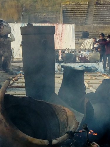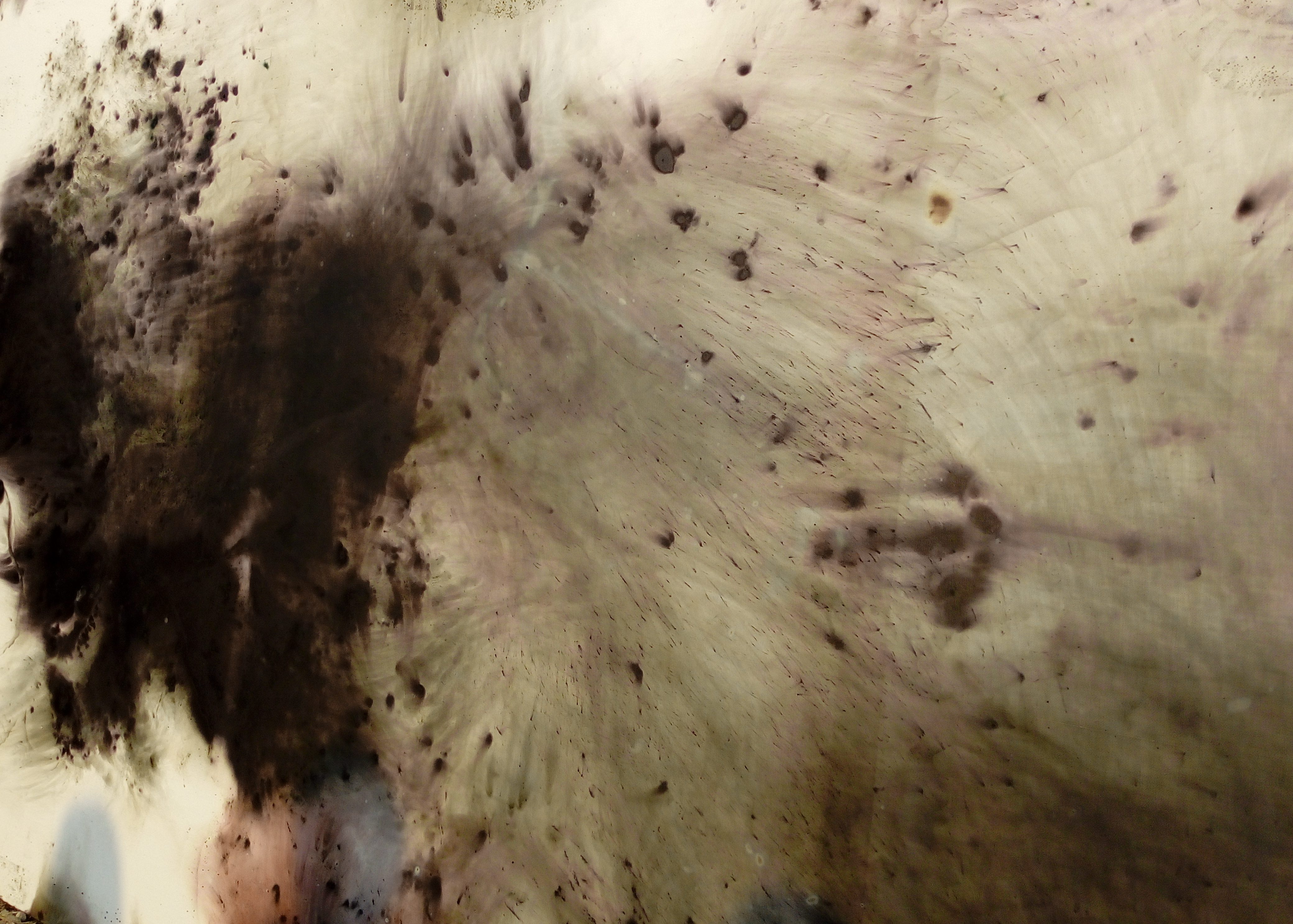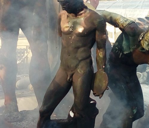 Dopo il boato infatti dalla coltre fumosa, che alla mente riporta descrizioni pliniane, sono apparse figure di statue e oggetti anneriti, cocci di anfore frantumate, il panno prima bianco ora pigmentato da colori pirotecnici, grossi pannelli ferrosi lavorati dal fuoco e dal fuoco trasformati in enormi ‘tableaux’ igneo-materici.