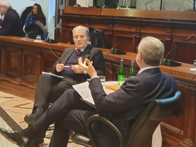 Il pericolo Europa, ha sottolineato l’esponente storico della sinistra, si colloca in una crisi economica globale che coinvolge non solo l’Europa ma il mondo intero, Russia, Cina, USA. Il binomio è per Prodi Populismo uguale Autorità, ove c’è il germe del populismo si insidia la bramosia d’autorità ed ha portato ad esempio i due movimenti che sono attualmente al governo, il Movimento Cinque Stelle e la Lega, due rami che si biforcano nel populismo in maniera differente, la Lega per definizione ed azione politica mentre i 5 stelle per la propria organizzazione peculiare. Non è un caso, infatti, che le derive populiste in Italia, continua il politico, non siano sfociate nella violenza come per i “Gilet Gialli” francesi soprattutto perché il movimento fondato da Grillo ha una organizzazione verticale e più stabile.