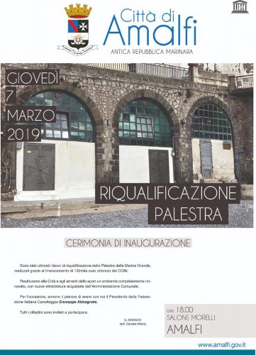 Giovedì taglio del nastro per la palestra della Marina Grande. La struttura dove si allenano i canottieri amalfitani ed anche l’equipaggio del galeone che ha vinto l’ultima Regata delle Antiche Repubbliche Marinare, è stata rinnovata grazie ad unfinanziamento di 132mila euro a fondo perduto ottenuto dal Coni.