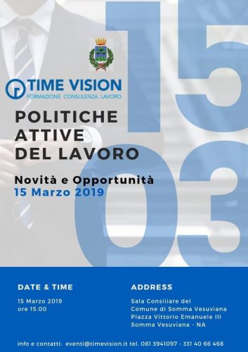 “Politiche attive del lavoro – Novità e opportunità”, il tema del convegno che si terrà venerdì 15 marzo alle ore 15 nell’aula consiliare del Comune di Somma Vesuviana, Piazza Vittorio Emanuele III.