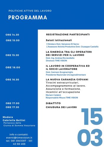 La società Time Vision, che collabora con l’Ente ed ha attivato uno Sportello per la consulenza a privati e aziende per l’orientamento al lavoro (attivo in municipio il lunedì, giovedì e venerdì’ dalle ore 9,30 alle 13,30) ha deciso di organizzare di concerto con l’Amministrazione guidata dal sindaco Salvatore Di Sarno l’appuntamento del 15 nell’ambito del ciclo di incontri formativi destinati ai consulenti del lavoro e i professionisti, puntando sulle novità e opportunità relative al tema delle Politiche Attive del lavoro.