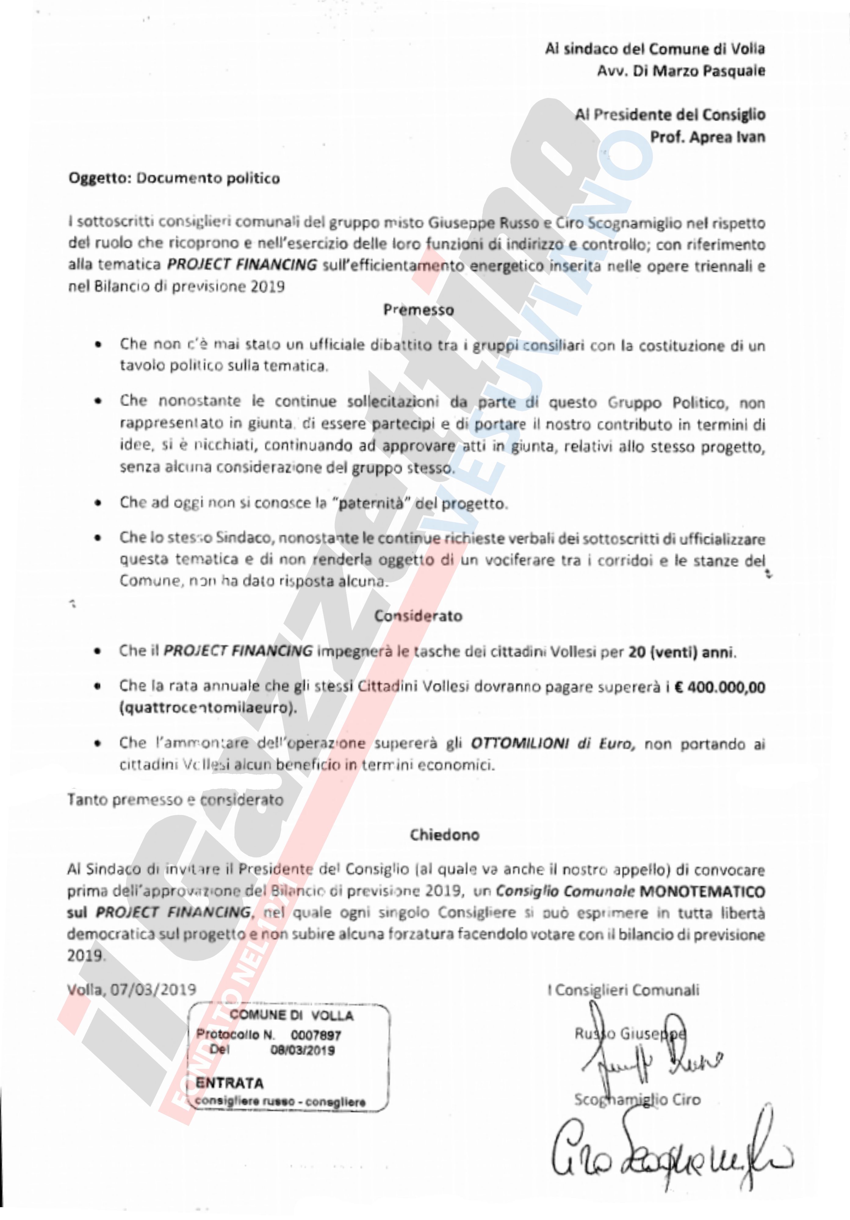 Scettici sono proprio i consiglieri dichiaratosi indipendenti Russo e Scognamiglio che hanno protocollato una nota (pubblicata in fondo) indirizzata al sindaco, ad inizio marzo, ma nota solo oggi, chiedendo spiegazioni e soprattutto di non parlare di questo progetto solo nei corridoi del comune e condividere le scelte sul punto. La richiesta dei consiglieri quella di un consiglio monotematico sulla questione. Che farà il sindaco Di Marzo? Proseguirà nel suo intento o accontenterà quanti, e al momento sembrerebbero ben più di due, stanno dimostrando dubbi sul project financing in questione?