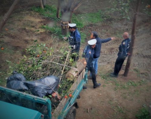 Orbene in tale fondo, a fine marzo, veniva osservato in azione un piccolo escavatore manovrato da un operaio che procedeva all’estirpazione di ulteriori tronchi e delle ceppaie radicali di alcuni esemplari arborei di arancio, che apparivano in buono stato di salute e con frutti sui rami, dopo che un altro operaio li aveva tagliati con una motosega. I rami e i tronchi venivano trasportati con una camionetta all’esterno.