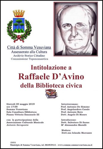 a biblioteca di Somma Vesuviana sarà intitolata a Raffaele D’Avino, uomo di cultura, illustratore del patrimonio artistico, storico e archeologico della città di Somma. A dodici anni dalla sua morte la cerimonia che si terrà giovedì 30 maggio alle ore 17 in municipio, voluta dal sindaco Salvatore Di Sarno, l’assessorato alla Cultura guidato da Flora Pirozzi, in collaborazione con l’archivio storico cittadino “Giorgio Cocozza” e la Commissione Toponomastica.