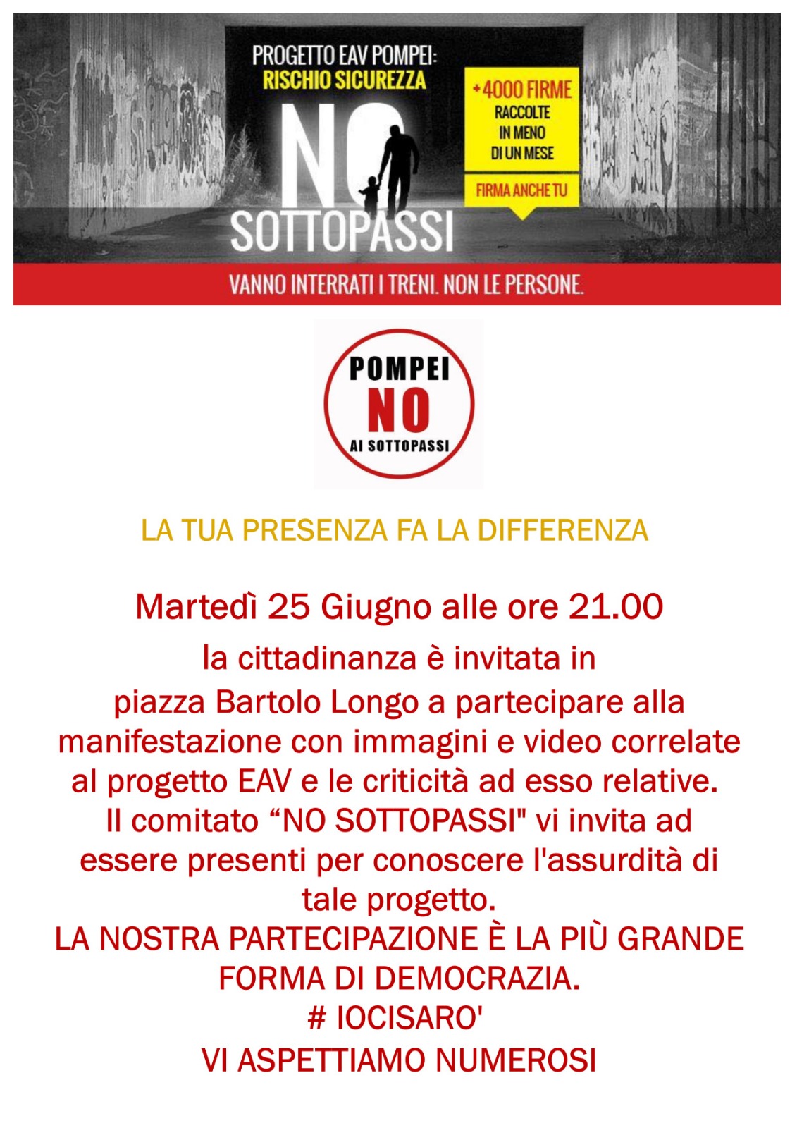 Questa sera, martedì 25 giugno, alle ore 21.00 la cittadinanza è invitata presso la sede del comitato in via Crapolla II a partecipare alla manifestazione con immagini e video correlate al progetto EAV e le criticità ad esso relative. L’evento che doveva svolgersi in Piazza Bartolo Longo è stato spostato presso la sede del comitato per problemi tecnici.