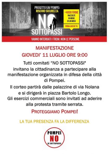 In più, dopo una serie di incontri in varie zone della città, prima in piazza Bartolo Longo poi nel quartiere popolare di via Nolana, i comitati No Sottopassi hanno chiamato una manifestazione cittadina da tenersi giovedì alle ore 9.00. Il corteo partirà dalle palazzine di via Nolana e raggiungerà la sede del Comune. Per tale data alcuni commercianti della zona hanno pensato di effettuare una serrata invitando gli altri esercenti di Pompei a fare lo stesso per esprimere la loro solidarietà alla lotta che ogni giorno sembra farsi più concreta.