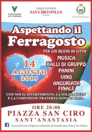 La solidarietà non va in vacanza e lo sa bene l’Associazione Religiosa Culturale di Beneficenza “San Ciro Onlus” che da ormai diversi anni organizza “Aspettando il Ferragosto. Con noi il divertimento, la solidarietà e la comunione fraterna sono di casa” evento pensato per rinfrescare ed allietare le calde sere estive di tanti anastasiani che per svariati motivi rimangono in città.