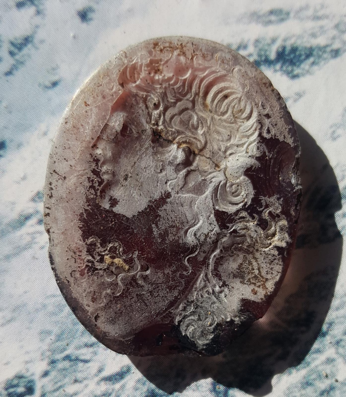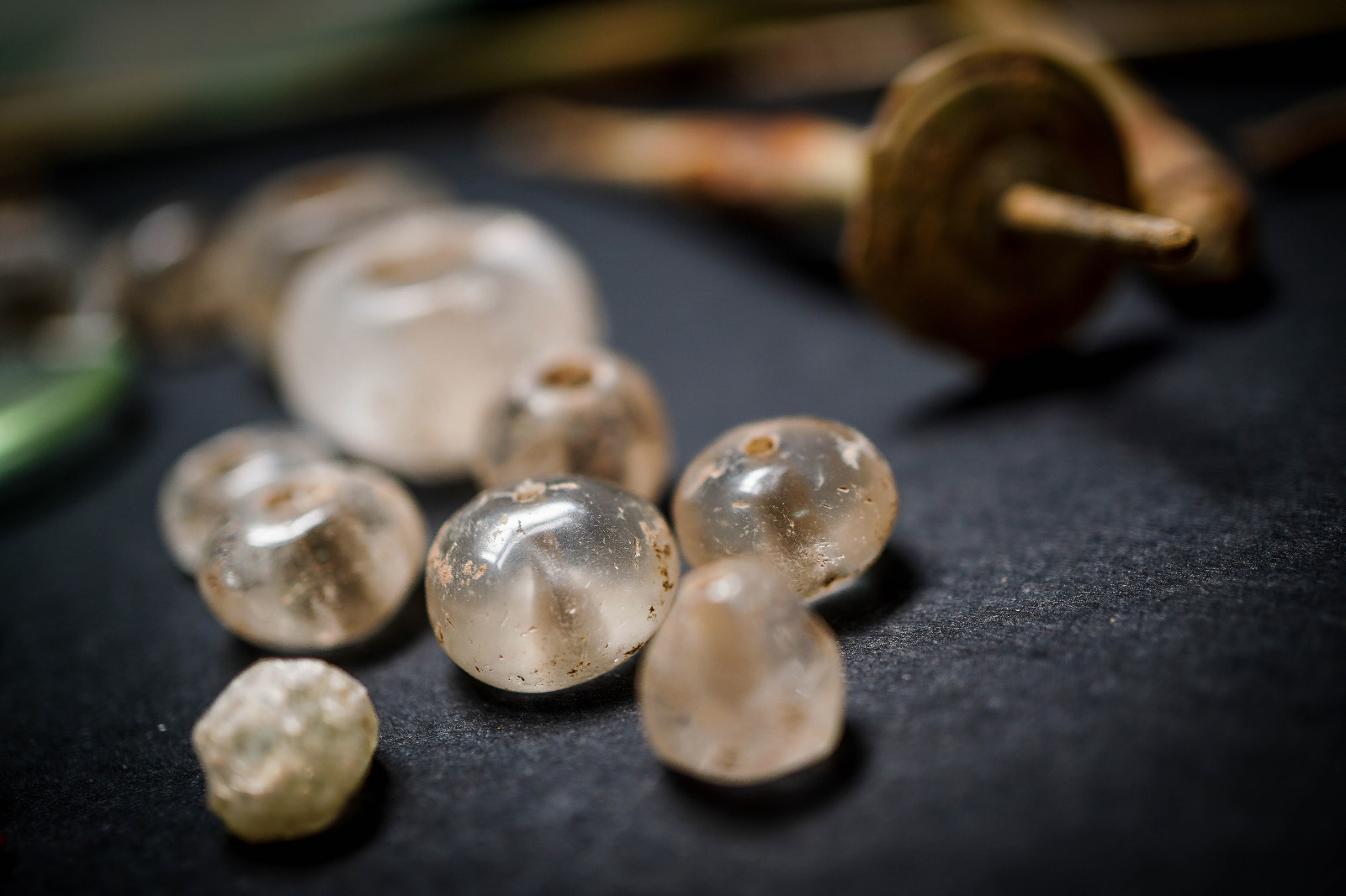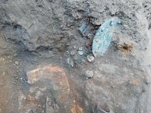 Sul fondo dell’impronta sono stati rinvenuti i numerosi oggetti preziosi, tra cui due specchi, diversi vaghi di collana, elementi decorativi in faïence, bronzo, osso e ambra, un unguentario vitreo, amuleti fallici, due frammenti di una spiga di circa 8 cm e una figura umana, entrambi in ambra, probabilmente dal valore apotropaico, e varie gemme (tra le quali una ametista con figura femminile e una corniola con figura di artigiano). Diversi pezzi si contraddistinguono per la qualità pregiata dei materiali, oltre che per la fattura. Tra le paste vitree, straordinarie sono quelle con incise, su una la testa di Dioniso, sull’altra un satiro danzante.