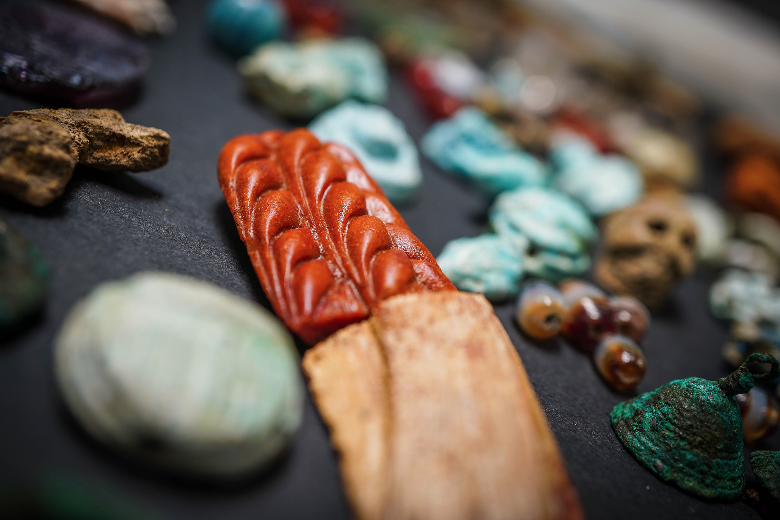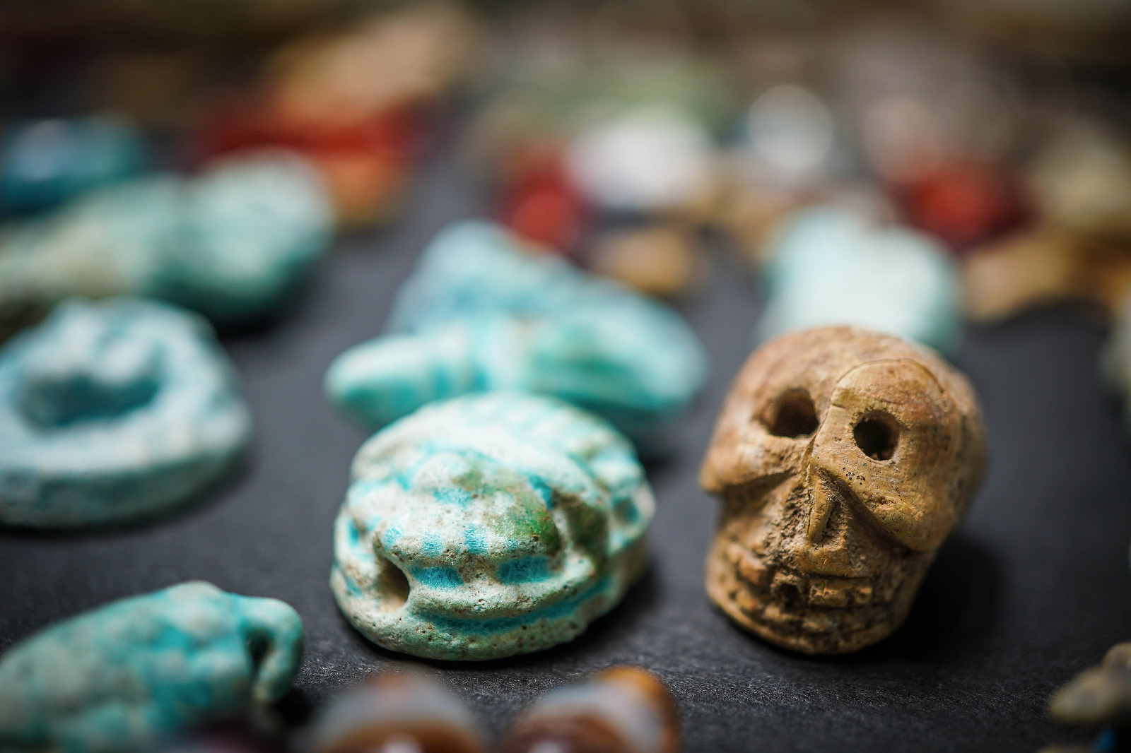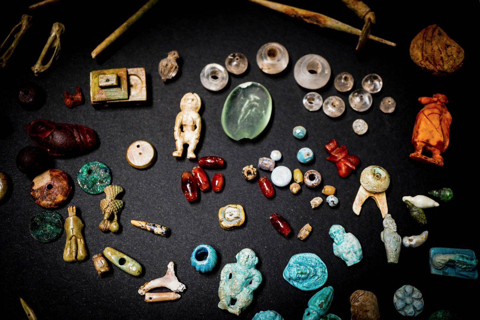 Amuleti, gemme ed elementi decorativi in faïence, bronzo, osso e ambra riemergono dallo scavo della Regio V. Erano monili e piccoli oggetti legati al mondo femminile, utilizzati per ornamento personale o per proteggersi dalla cattiva sorte, ritrovati in uno degli ambienti della casa del Giardino.