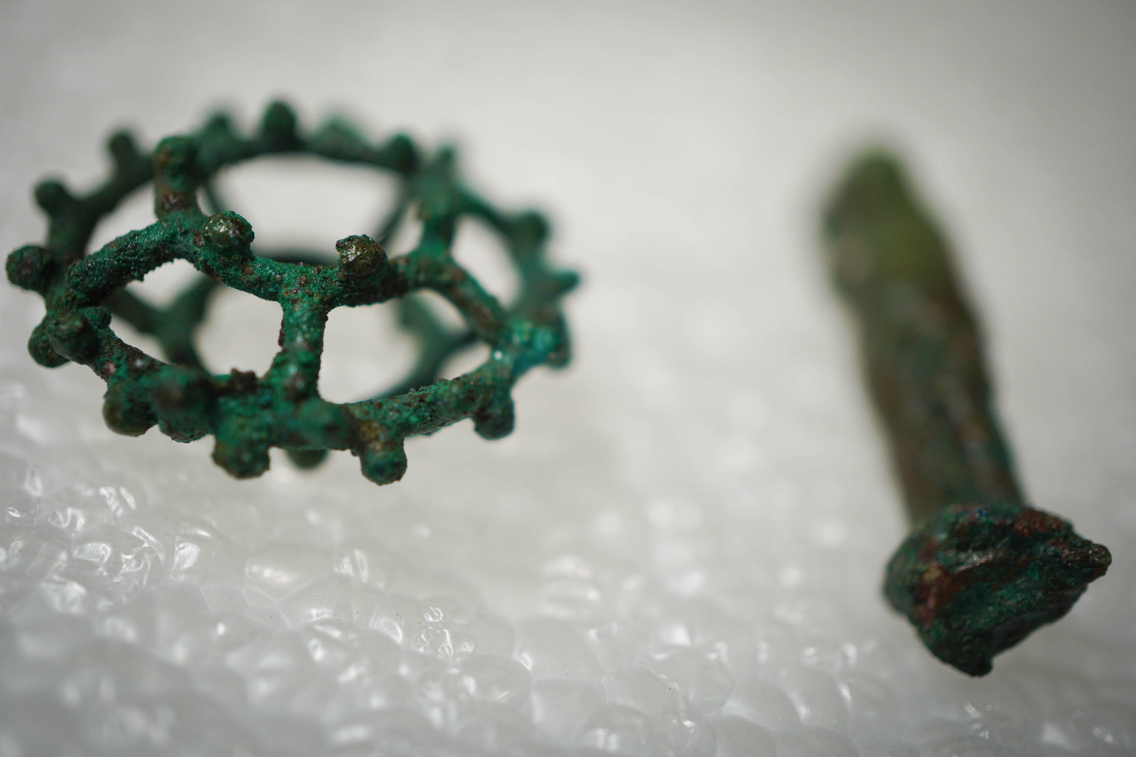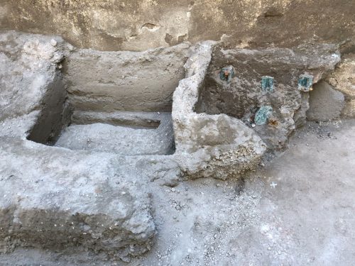 Alcuni oggetti preziosi sono stati rinvenuti anche in una altra stanza della casa, presso l’atrio, dove sono stati documentati i resti scheletrici di donne e bambini, sconvolti da scavi clandestini di età moderna (XVII – XVIII secolo), probabilmente finalizzati proprio al recupero dei preziosi che le vittime portavano con sé. Solo un anello in ferro, ancora al dito della vittima, e un amuleto di faïence sono casualmente sfuggiti a questo saccheggio.