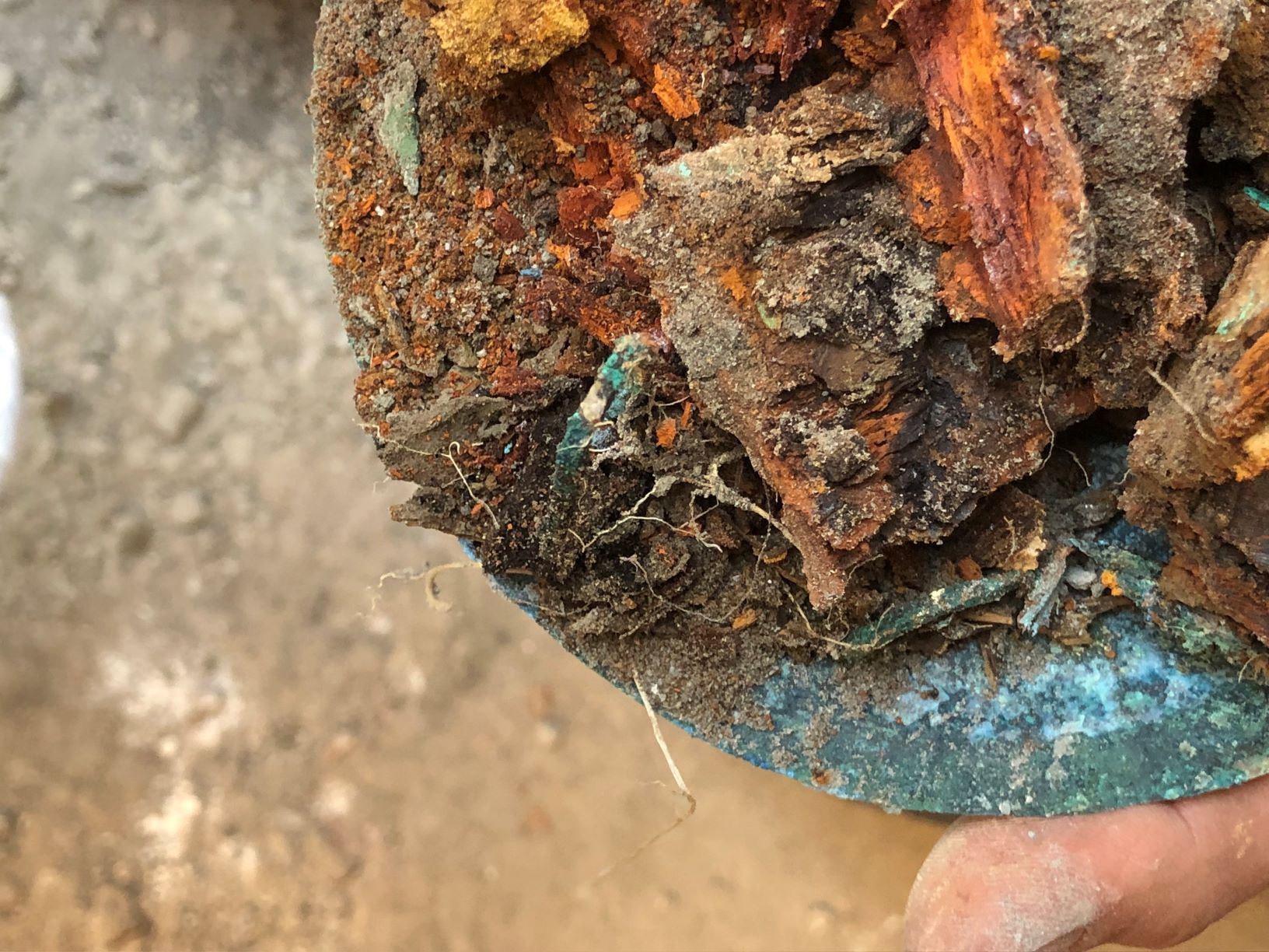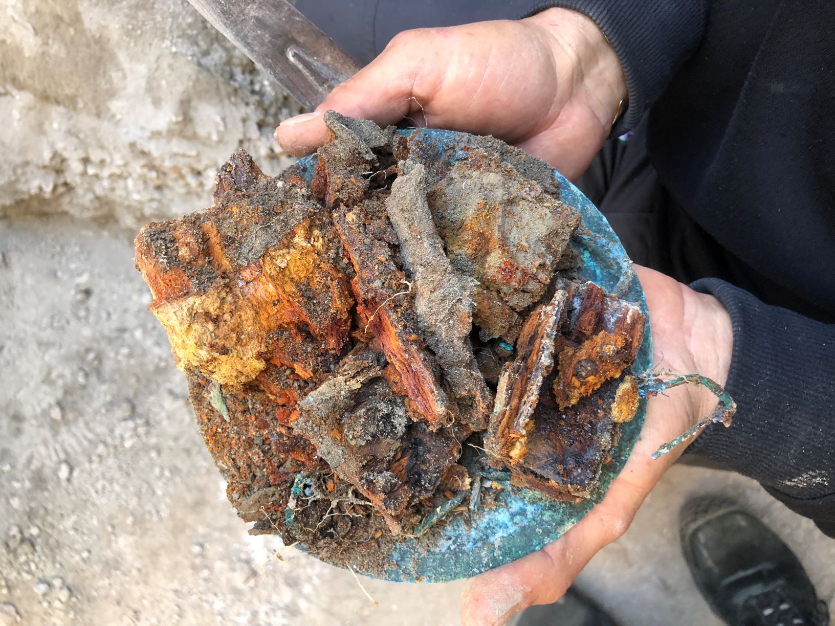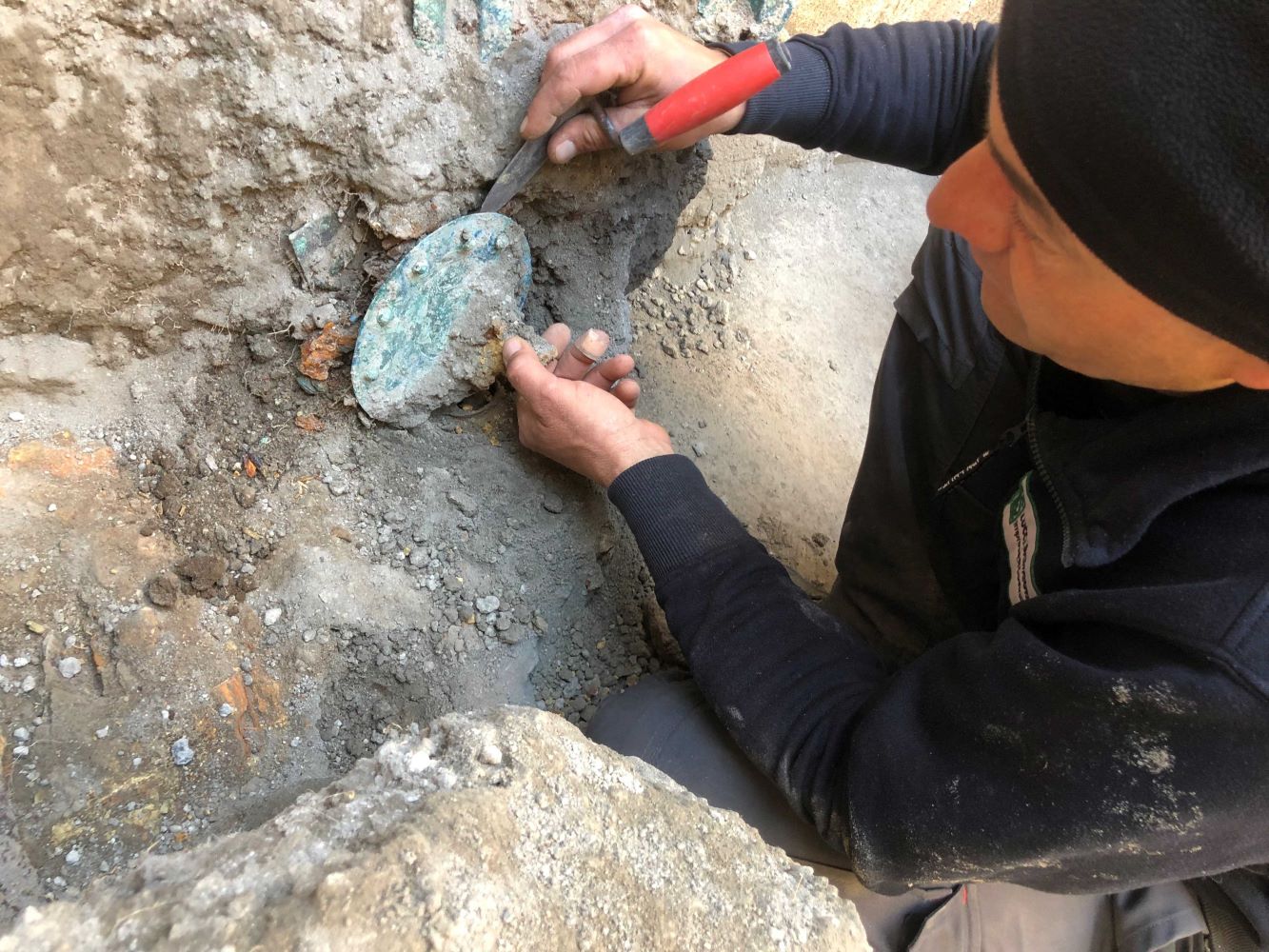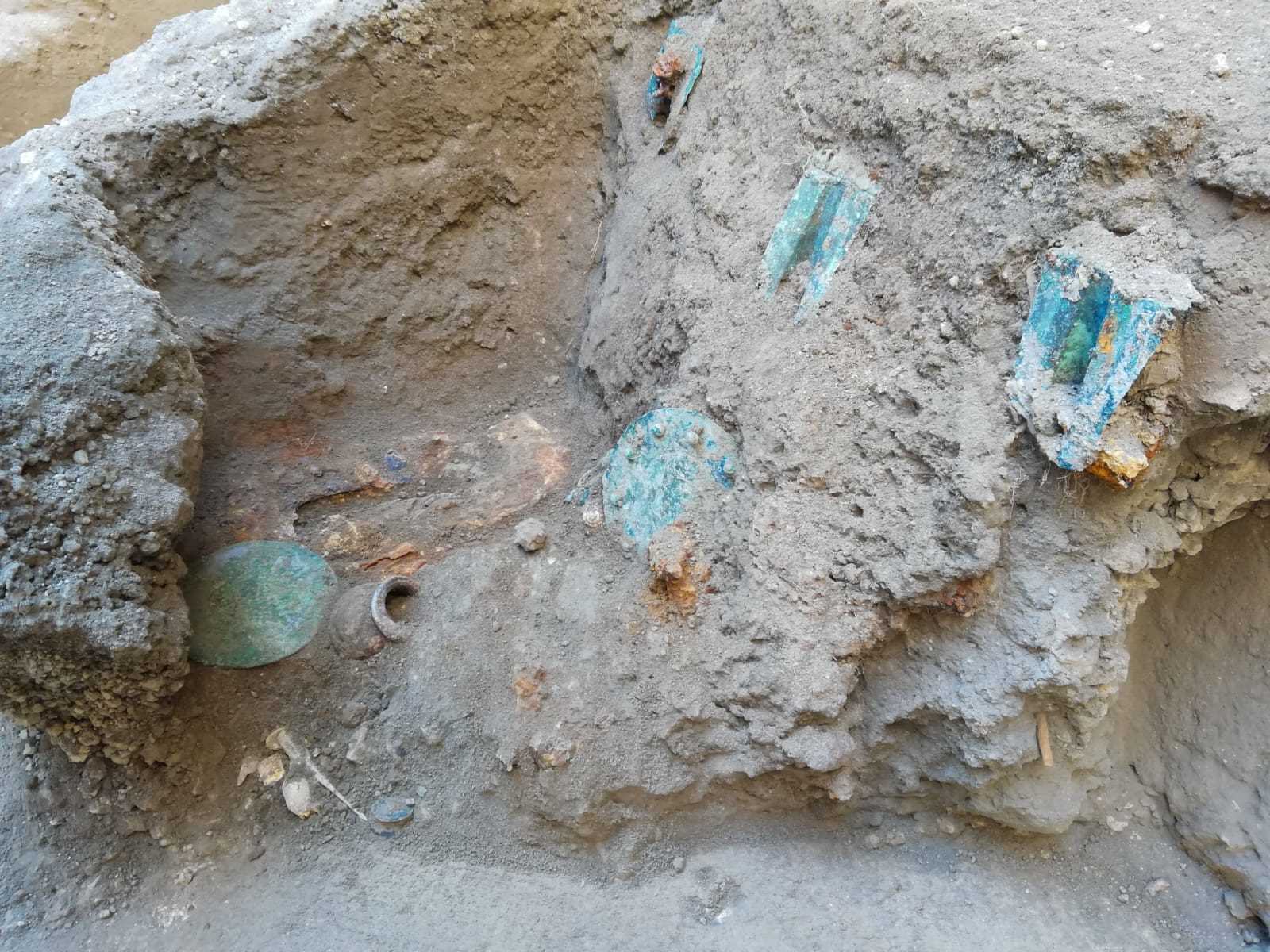 La traccia della cassa in legno che conteneva i reperti, le cui cerniere bronzee si sono ben conservate all’interno del materiale vulcanico, a differenza della parte lignea decompostasi, è stata individuata accanto all’impronta di un’altra cassa o mobile nell’angolo di uno degli ambienti di servizio, probabilmente usato come deposito.