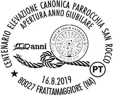Poste Italiane informa che venerdì 16 agosto sarà disposto un servizio di annullo filatelico figurato, recante la dicitura: “Centenario elevazione canonica Parrocchia San Rocco – Apertura giubilare – 16.8.2019 – 80027 Frattamaggiore (NA)”.