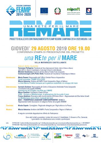 La conferenza stampa di presentazione si terrà giovedì 29 agosto alle 19 a Villa Materazzo nel comune di Santa Maria di Castellabate. Antonino Miccio moderera’ l’incontro. Parteciperanno: Tommaso Pellegrino, presidente del Parco Nazionale del Cilento e Vallo di Diano, Michele Giustiniani, presidente dell’Amp Punta Campanella, il contrammiraglio Pietro Vella, presidente dell’Amp Regno di Nettuno, Maria Passari, responsabile dell’ufficio centrale pesca e acquacoltura fondi comunitari 2014/2020, Nicola Caputo, consigliere regionale delegato all’agricoltura e alla pesca, Carmela Guidone, responsabile centro educazione ambientale Punta Campanella, Marco Gualtieri, presidente di Seeds & chips, Franco Andaloro, ricercatore delle risorse biotiche Stazione biologica Anthon Dhorn e rappresentanti delle varie associazioni e cooperative di pesca.