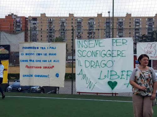 C’è la squadra proveniente da Milano dedicata a Marcella di Levrano, vittima innocente della Sacra Corona Unita, quella dei ragazzi della giustizia riparativa di Napoli dedicata a Genny Cesarano, vittima innocente della camorra nel quartiere Sanità, la squadra di Libera dedicata a Hyso Telharaj, giovane albanese ucciso dai caporali nelle campagne del foggiano. E sulla rete del campo dell’Arci di Scampia uno striscione per Rosario La Rossa Scampia “Insieme per sconfiggere il drago” firmato Libera, Amunì e tutte le squadre partecipanti. Ha preso inizio stamattina Libera in Goal, il torneo di calcio a cinque dedicato ad Antonio Landieri – vittima innocente di Camorra – organizzato da Vo.di.Sca.;Libera; Get Up e Legalité, Associazione “Dream Team donne in rete e Scuola Calcio Arci Scampia. Il torneo che si conclude domenica 8 settembre si svolge presso il campo sportivo dell’ARCI Scampia in Via Fratelli Cervi.