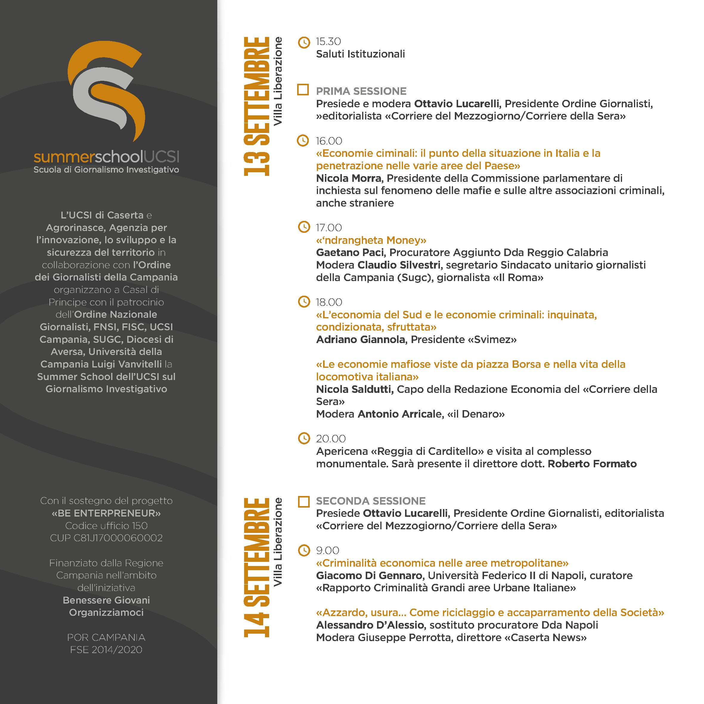 Nel corso dei seminari è previsto anche un confronto tra le due realtà pubbliche più importanti in Italia – i Consorzi “Agrorinasce” in Campania e “Sviluppo e legalità” in Sicilia – la Regione Campania e l’Agenzia nazionale per l’Amministrazione e la destinazione dei beni confiscati alle mafie.La Summer School 2019 andrà oltre i confini nazionali e potrà contare sulla presenza di tanti esperti e giornalisti di fama internazionale. Presenti a Casal di Principe, tra gli altri, il presidente della Commissione Antimafia, Nicola Morra; il comandante della Dia, il generale Giuseppe Governale; il procuratore aggiunto Dda Reggio Calabria, Gaetano Paci; il procuratore della Repubblica di Napoli, Giovanni Melillo; il presidente “Svimez”, Adriano Giannola; il capo della redazione “Economia” del Corriere della Sera, Nicola Saldutti; il generale Umberto Rapetto, già comandante Nucleo Frodi Telematiche Guardia di Finanza, Autorità privacy Repubblica di San Marino; il senatore Pietro Grasso, già procuratore nazionale Antimafia; il direttore del Centro nazionale trapianti, Massimo Cardillo; la senatrice Rosaria Capacchione; il testimone oculare dell’omicidio di Don Giuseppe Diana, Augusto Di Meo; l’europarlamentare Franco Roberti, già procuratore nazionale Antimafia; il sindaco di Corleone Nicolò Nicolosi, presidente del Consorzio “Sviluppo e legalità”; il direttore dell’Agenzia nazionale per l’Amministrazione e la destinazione dei beni sequestrati e confiscati alla criminalità organizzata, il prefetto Bruno Frattasi; il sostituto procuratore Dda Napoli, Alessandro D’Alessio; Giacomo Di Gennaro, Università Federico II di Napoli, curatore del “Rapporto criminalità grandi aree urbane italiane”; lo scrittore e giornalista Sergio Nazzaro.