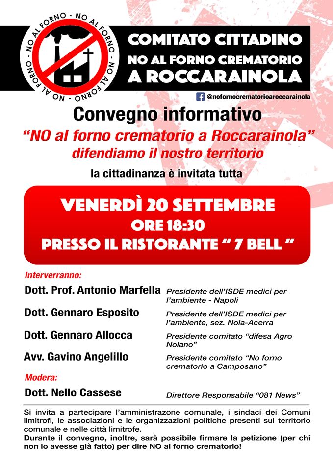 Venerdì 20 settembre ci sarà un convegno “No al forno crematorio a Roccarainola, difendiamo il nostro territorio”, cui parteciperanno diversi relatori tra cui il Dott. Prof. Antonio Marfella presidente dell’ISDE medici per l’ambiente Napoli.