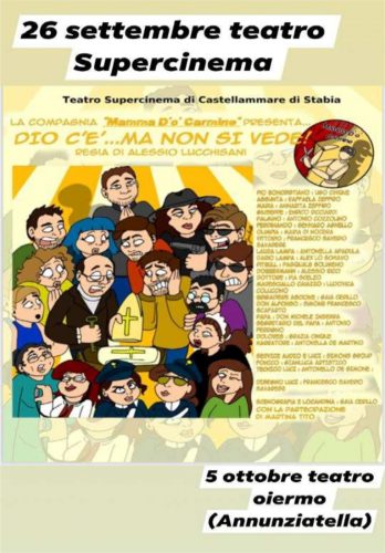 Il 26 settembre alle ore 21:00, presso il teatro “Supecinema” di Castellammare di Stabia, ed il 5 ottobre al teatro OIERMO, i ragazzi della Compagnia teatrale amatoriale “Mamm do’ Carmin”, porteranno in scena la commedia in tre atti “Dio c’è ma non si vede”,scritta da Denny Auricchiello, con la regia di Alessio Lucchisani.