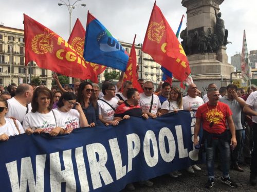 Ieri un arrabbiato e partecipato corteo per Corso Umberto a Napoli dei lavoratori dello stabilimento Whirlpool di via Argine. La città ha risposto compatta e solidale alla chiamata degli operai. La lotta dei lavoratori Whirlpool di Napoli che chiedono il rispetto dell’accordo siglato ad ottobre del 2018 con il Governo, sta diventando il simbolo di un Sud che crede nel lavoro. A sfilare insieme alle maestranze dell’azienda produttrice di elettrodomestici della multinazionale americana anche i Navigator della Campania e gli studenti universitari.