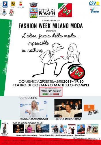 Lo speciale evento, che vuole abbattere le “barriere culturali” nel mondo del fashion, giunto quest’anno alla quinta edizione, è promosso dalla “Unione italiana per la lotta alla distrofia muscolare” (Uildm) – sezione di Ottaviano, in collaborazione con l’associazione «Fashion Week Milano Moda» (FWMM), con il supporto organizzativo della città di Pompei e con il patrocinio morale della regione Campania, della Città metropolitana di Napoli, del comune di Napoli, del comune di Ottaviano e del comune di Striano.