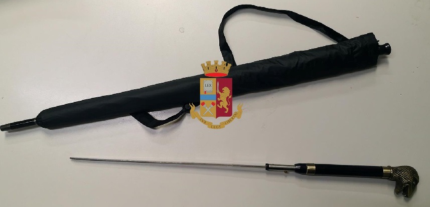 I poliziotti hanno eseguito una perquisizione rinvenendo e sequestrando un bastone animato lungo circa 1 metro con una lama interna lunga 37 cm, illegalmente detenuto.